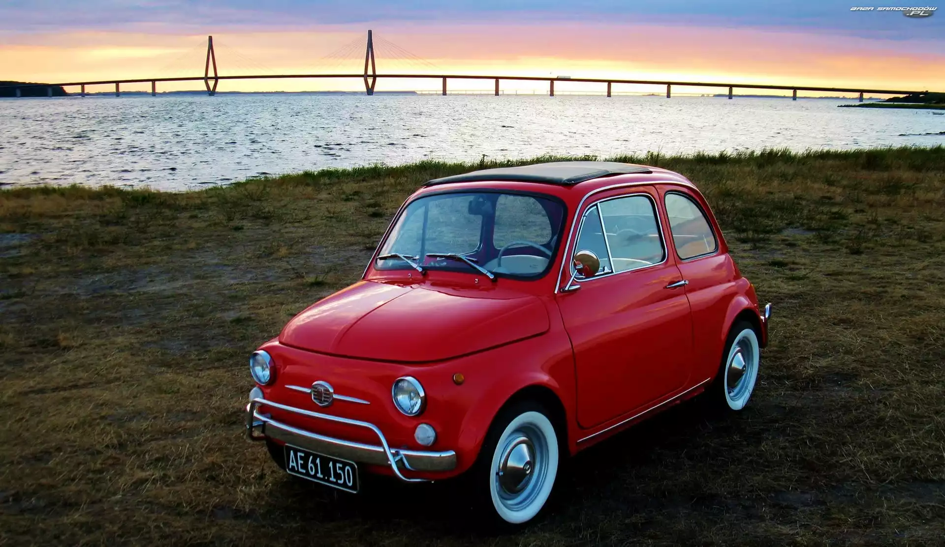 Samochód: Fiat 500, Most, Czerwony, Rzeka